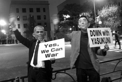 當(dāng)晚,位于東京的首相官邸周邊戒備森嚴(yán)。在首相官邸的斜對(duì)面,抗議民眾打出反對(duì)奧巴馬訪日、反對(duì)行使集體自衛(wèi)權(quán)、反對(duì)在沖繩新建軍事基地等標(biāo)語。