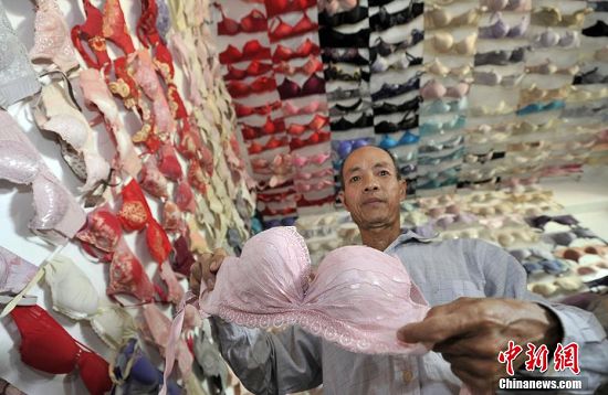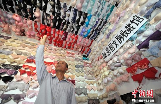 [國(guó)內(nèi)新聞]4月21日,海南省三亞市崖城鎮(zhèn)的陳清祖花費(fèi)20年時(shí)間收集5000余件文胸,在一間棟不起眼小房間的墻壁上、天花板上掛滿了各式各樣的女性文胸,數(shù)量多達(dá)5000余件,而這些令人目不暇接的“藏品”來自全國(guó)30多所高校的女生。據(jù)陳清祖介紹,他的夢(mèng)想是將來打造一間文胸收藏館,通過展示內(nèi)衣,提高全社會(huì)對(duì)女性乳房健康的關(guān)注度。圖為陳清祖展示他的“特別藏品”。