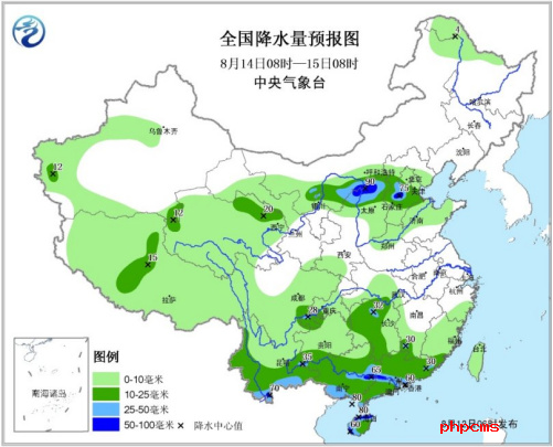 圖3 全國(guó)降水量預(yù)報(bào)圖(8月14日08時(shí)—15日08時(shí))