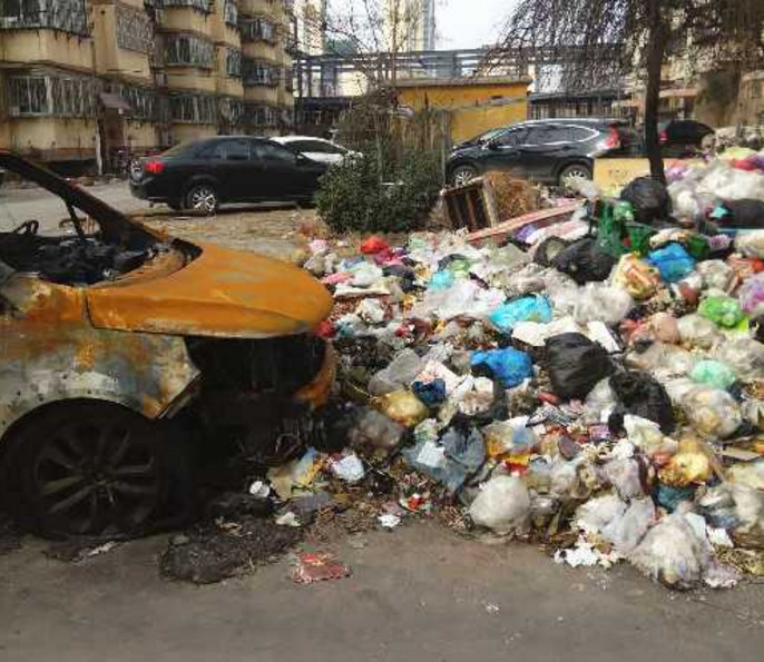 2月28日上午,記者來到農(nóng)機(jī)小區(qū),一進(jìn)小區(qū)大門就看到了堆積在7號樓前的巨型垃圾山,原來的藍(lán)色垃圾桶早已被埋進(jìn)“山”中,垃圾山旁還停著一輛被燒得面目全非的小轎車。