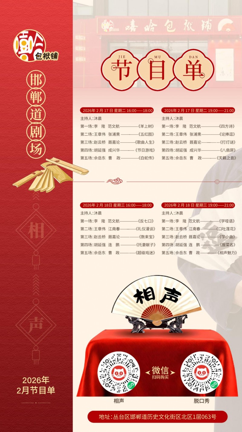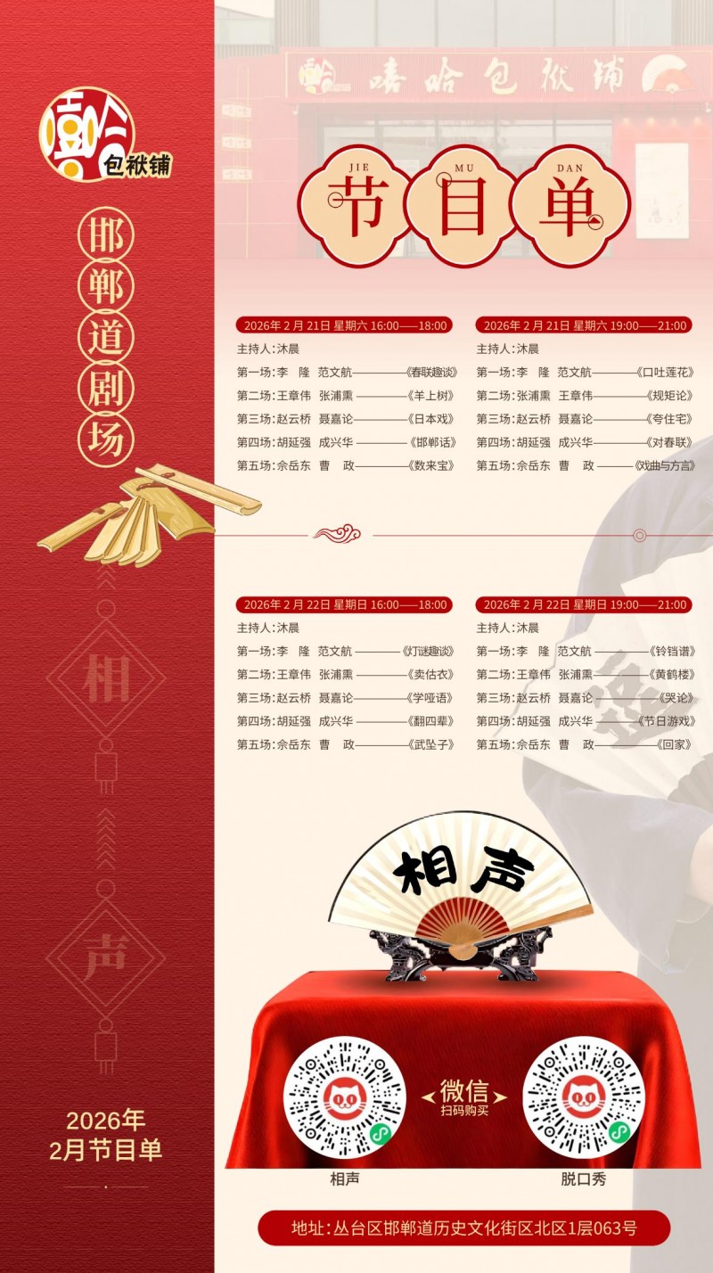 嘻哈包袱鋪邯鄲道劇場(chǎng)新春專(zhuān)場(chǎng)正式啟售,正月初一至初七每日開(kāi)演,兩場(chǎng)黃金場(chǎng)次任選,這個(gè)春節(jié),拒絕平淡,告別無(wú)聊,讓相聲承包全家的歡樂(lè),讓笑聲填滿(mǎn)每一段團(tuán)圓時(shí)光。